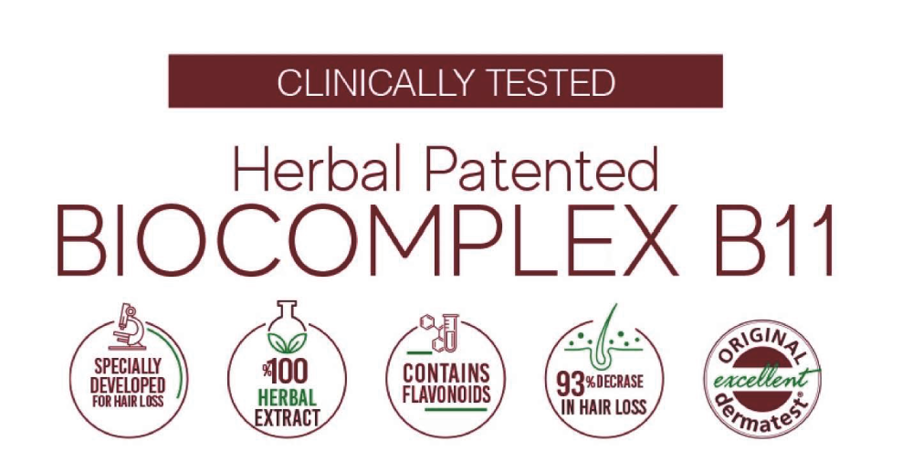 The effectiveness of this impressive formulation was proven in a study conducted in 2011 by the University of Pavia, Italy. The research showed that regular use of shampoo and serum containing BioComplex B11 significantly reduced hair loss. Clinical tests revealed the nourishing effects of the products on hair follicles and their ability to help prevent hair loss.